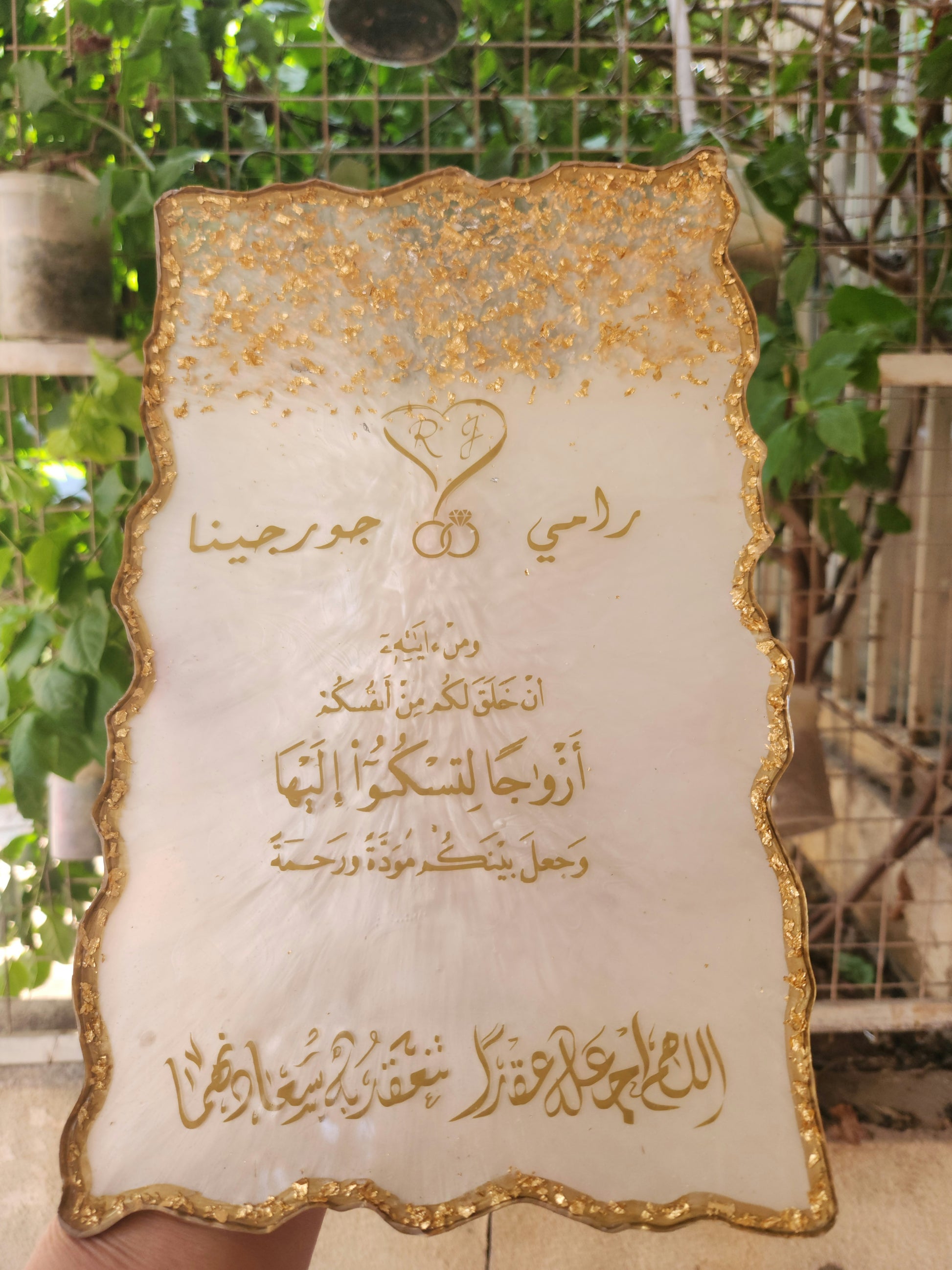 Celebrate love and memories with our handcrafted resin wedding frame, a truly unique and personalized gift for weddings. This elegant rectangular frame showcases a names of the bride and groom alongside pieces of their wedding religiousquotes, beautifully preserved forever in crystal-clear resin.